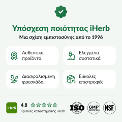 Ενώ η iHerb καταβάλλει κάθε δυνατή προσπάθεια να διασφαλίσει την ακρίβεια των εικόνων και των πληροφοριών των προϊόντων της, ορισμένες αλλαγές από τον κατασκευαστή στη συσκευασία ή/και στα συστατικά ενδέχεται να μην έχουν ακόμη ενημερωθεί στον ιστότοπό μας. Παρόλο που τα είδη ενδέχεται περιστασιακά να αποστέλλονται με εναλλακτική συσκευασία, η φρεσκάδα τους είναι πάντα εγγυημένη. Σας συνιστούμε να διαβάζετε τις ετικέτες, τις προειδοποιήσεις και τις οδηγίες όλων των προϊόντων πριν από τη χρήση και να μην βασίζεστε αποκλειστικά στις πληροφορίες που παρέχονται από την iHerb. Αυτός ο ιστότοπος έχει μεταφραστεί με τη χρήση αυτοματοποιημένου συστήματος (μηχανική μετάφραση) για τη διευκόλυνση των πελατών. Η iHerb δεν εγγυάται ότι οι μεταφράσεις είναι πλήρεις ή χωρίς σφάλματα και δεν φέρει καμία ευθύνη για τυχόν μεταφραστικά λάθη ή παραλείψεις.